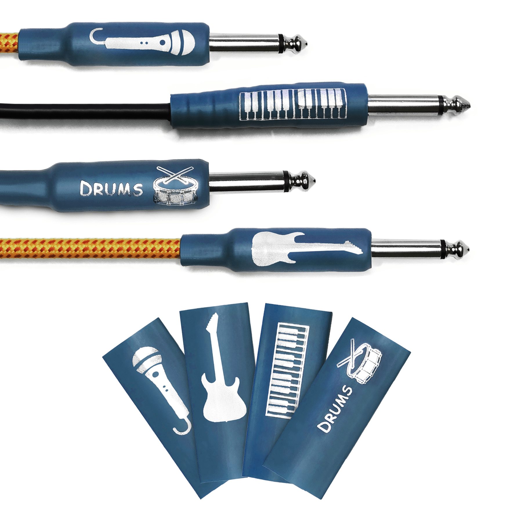 Heat Shrink Tubing – a themed collection created for clear and stylish cable identification. Each tube features a unique print — guitar, piano, drums, and microphone — making it easy to distinguish different instrument, studio, or stage cables at a glance.